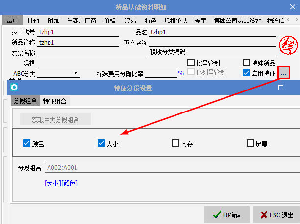 1、启用特征组合,货品特征分段建档里的分段代号会自动编码