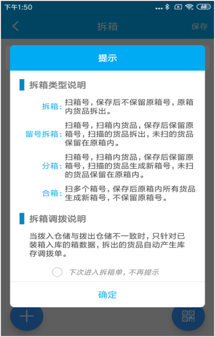 打开单据后,会弹出提示界面,介绍拆箱类型说明(拆箱、留号拆箱、分箱、合箱)和拆箱调拨说明,如果不需要弹出提示,可以勾选“下次进入拆箱单,不再提示”。